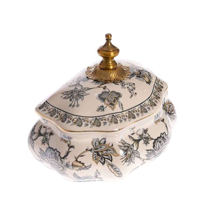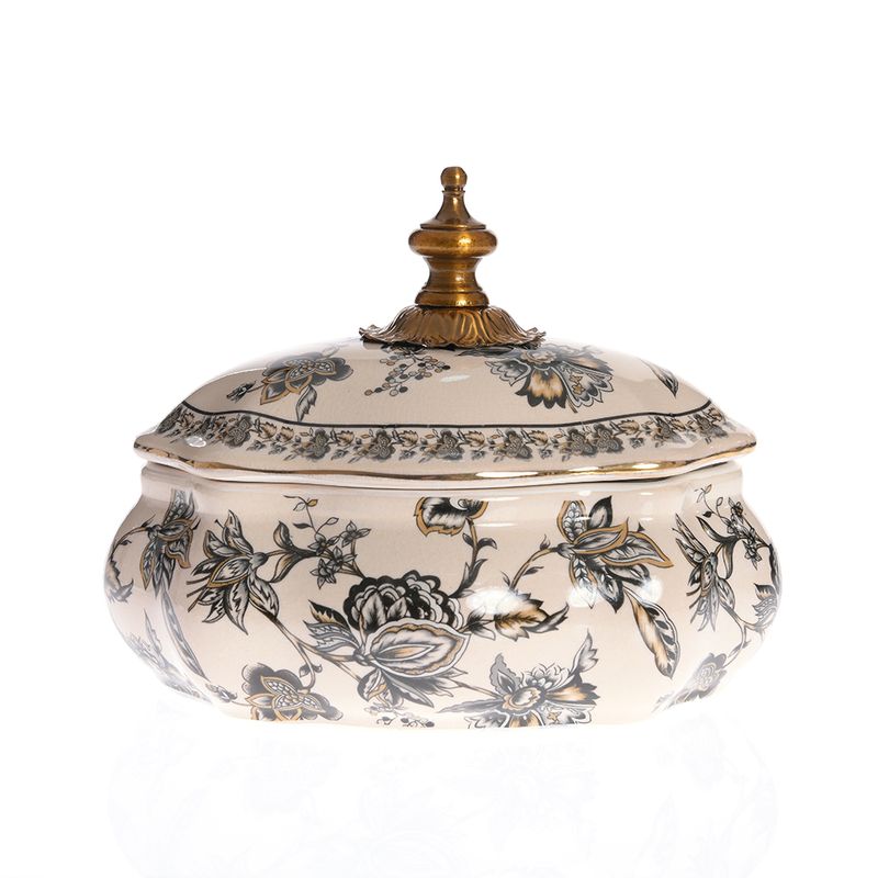 Bol decorativ din ceramica, cu capac elegant si imprimeu floral clasic in nuante aurii si gri. Ideala pentru depozitarea accesoriilor mici sau ca piesa de decor rafinata. Accentele aurii si forma curba ii ofera un farmec aparte.