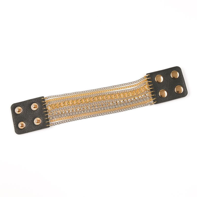 Tip produs: Bratara Culoare: Negru, Auriu, Argintiu Material: Poliuretan, Aliaj zinc Compozitie: 50% Poliuretan, 40% Aliaj zinc, 10% Acrilic Dimensiuni: ~ 20 x 4 cm (L x l) Sistem de prindere: Capse