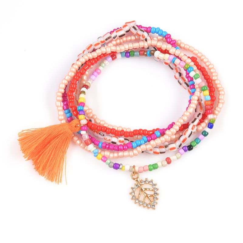 Bratara de picior formata din siraguri multicolore de margele, accesorizata cu ciucure portocaliu si pandantiv inima decorat cu cristale fine. Un accesoriu vibrant, ideal pentru tinute estivale.