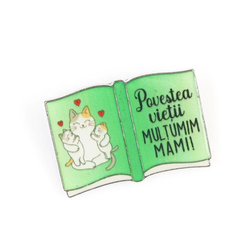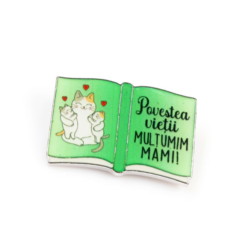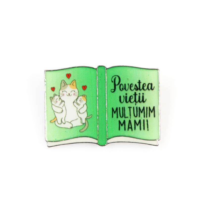 Tip produs: Brosa, contine snur de martisor si plic Material: Aliaj zinc Culoare: Multicolor Compozitie: 70% Aliaj zinc, 30% Acrilic Dimensiuni: ~ 2.5 x 3.5 cm Sistem de prindere: Ac Mesaj: Povestea vietii. Multumim mami!