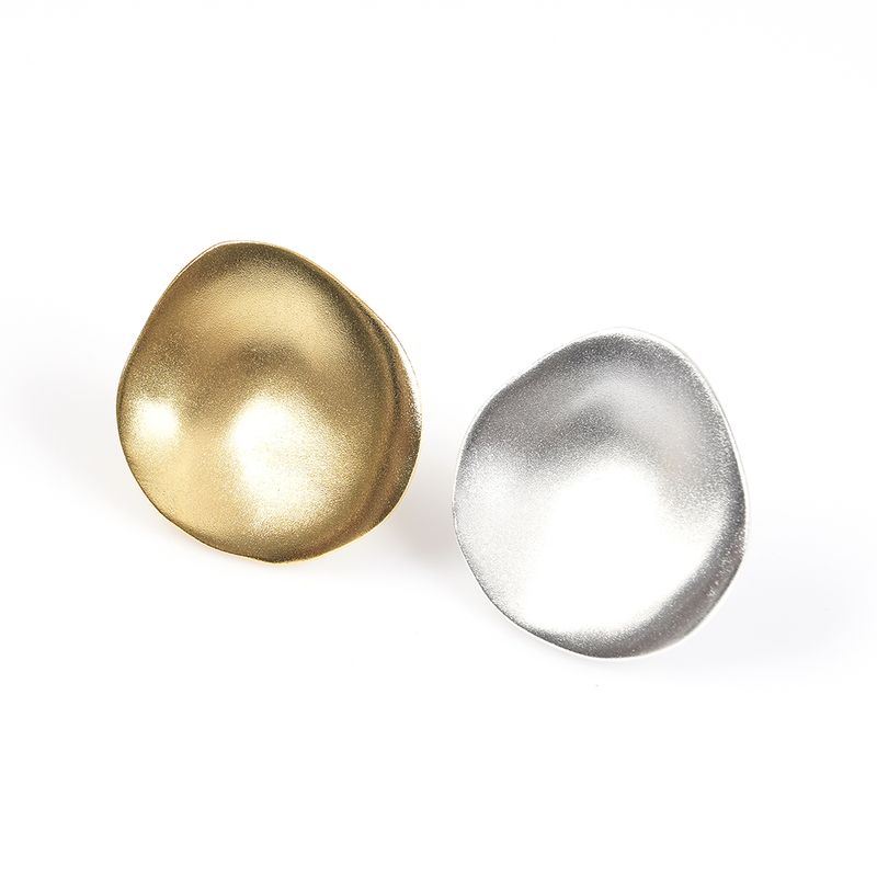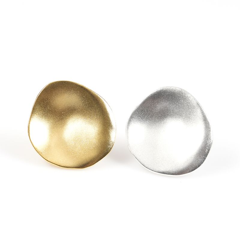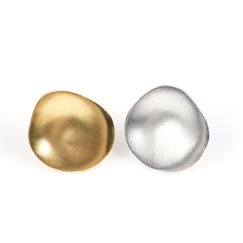 Cercei statement cu design organic si forma neregulata, realizati din metal cu finisaj mat in nuante contrastante – auriu si argintiu. O alegere moderna pentru tinute minimaliste sau creative. Sistem de prindere cu surub.