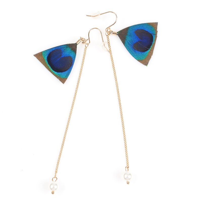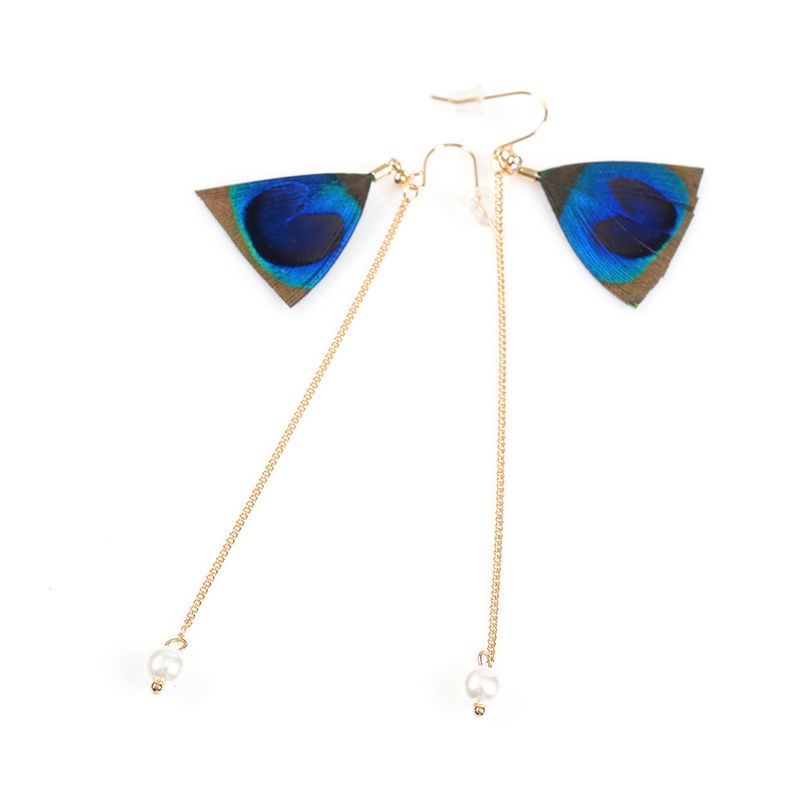 Cercei delicati decorati cu pene naturale de paun in nuante vibrante de albastru si verde, completati de un lant subtire auriu cu perlute la capat. Un accesoriu elegant si original, perfect pentru tinute boho sau de ocazie.