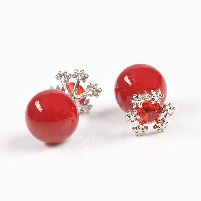 Cercei eleganti cu design dublu: glob rosu lucios si detaliu de fulg argintiu cu cristal rosu central. Accesoriu rafinat si festiv, perfect pentru sezonul rece.
