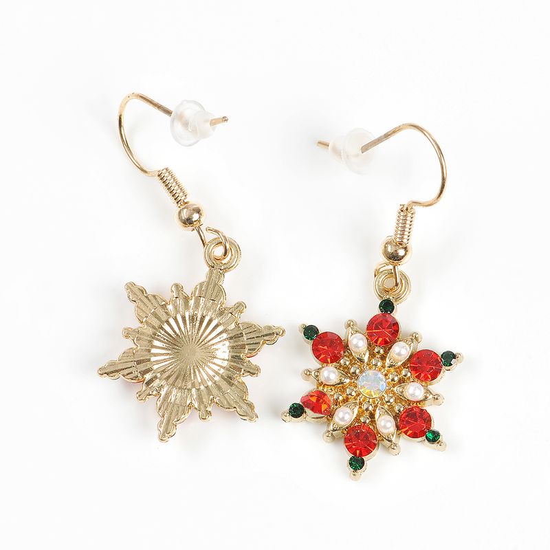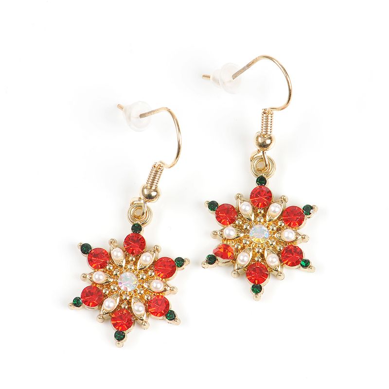 Cercei stralucitori in forma de fulg de nea, decorati cu cristale rosii, perle elegante si detalii verzi pe suport auriu. Un accesoriu rafinat, ideal pentru sezonul sarbatorilor.