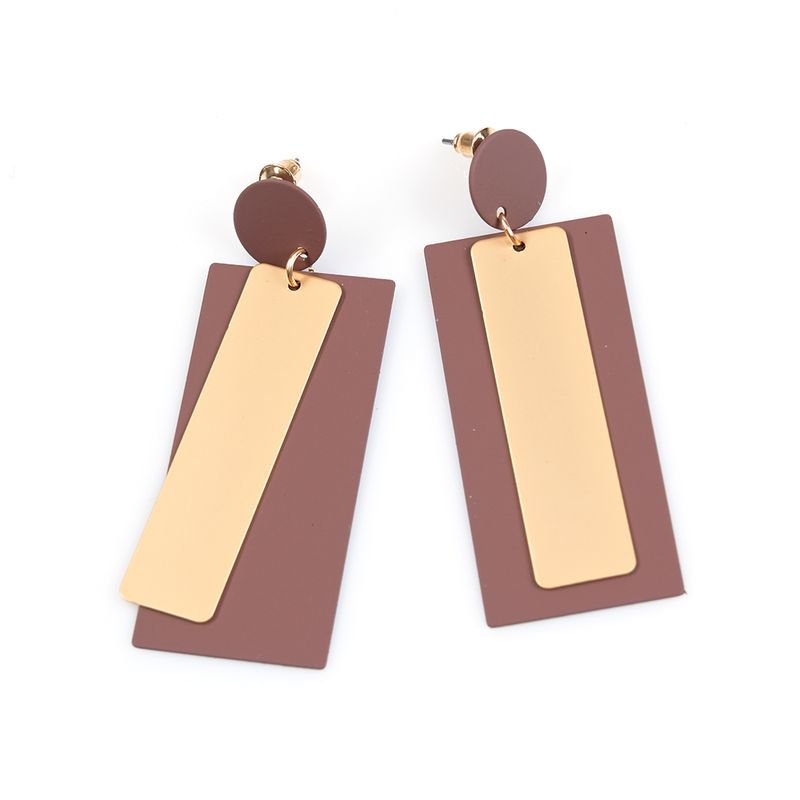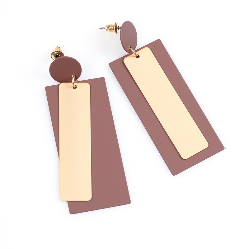 Cercei cu forme arhitecturale, realizati din elemente dreptunghiulare in nuante de maro mat si auriu lucios. O alegere ideala pentru un look urban, elegant si contemporan. Sistem de prindere tip surub.