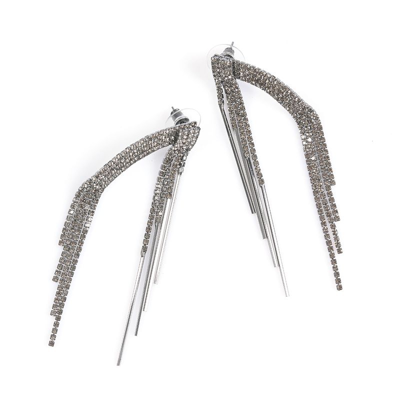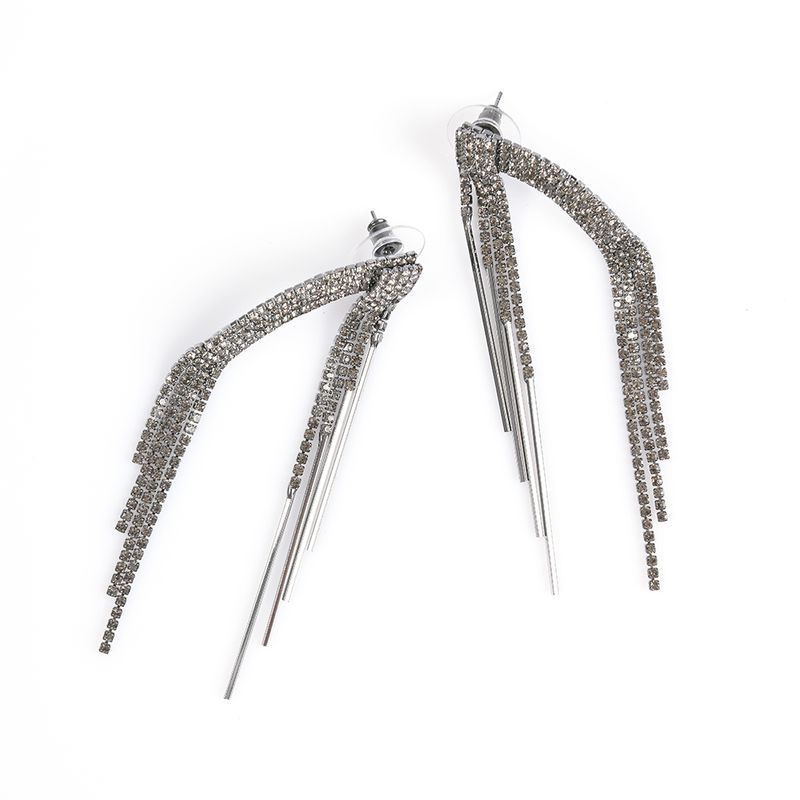 Cercei statement cu strasuri stralucitoare si franjuri metalici subtiri, ideali pentru evenimente speciale sau tinute de seara. Design elegant si modern, care atrage atentia si completeaza perfect un look sofisticat.