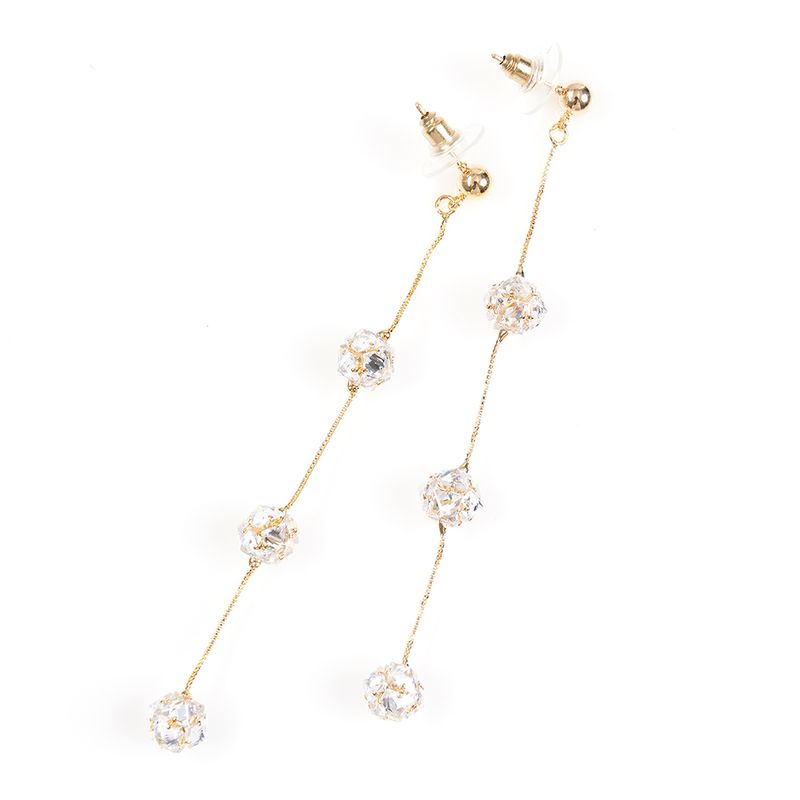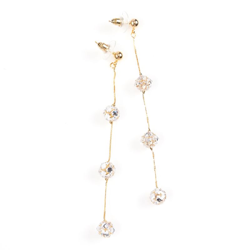 Cercei eleganti cu design minimalist si modern, formati din lant auriu subtire si sfere stralucitoare din cristale transparente. Perfecti pentru tinute de seara, evenimente speciale sau ocazii festive. Sistem de prindere tip tortita.