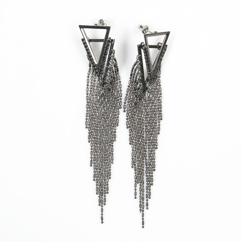 Cercei statement cu baza triunghiulara si franjuri din lanturi fine, ideali pentru un look elegant si indraznet. Finisajul negru metalic adauga un aer modern si rafinat.