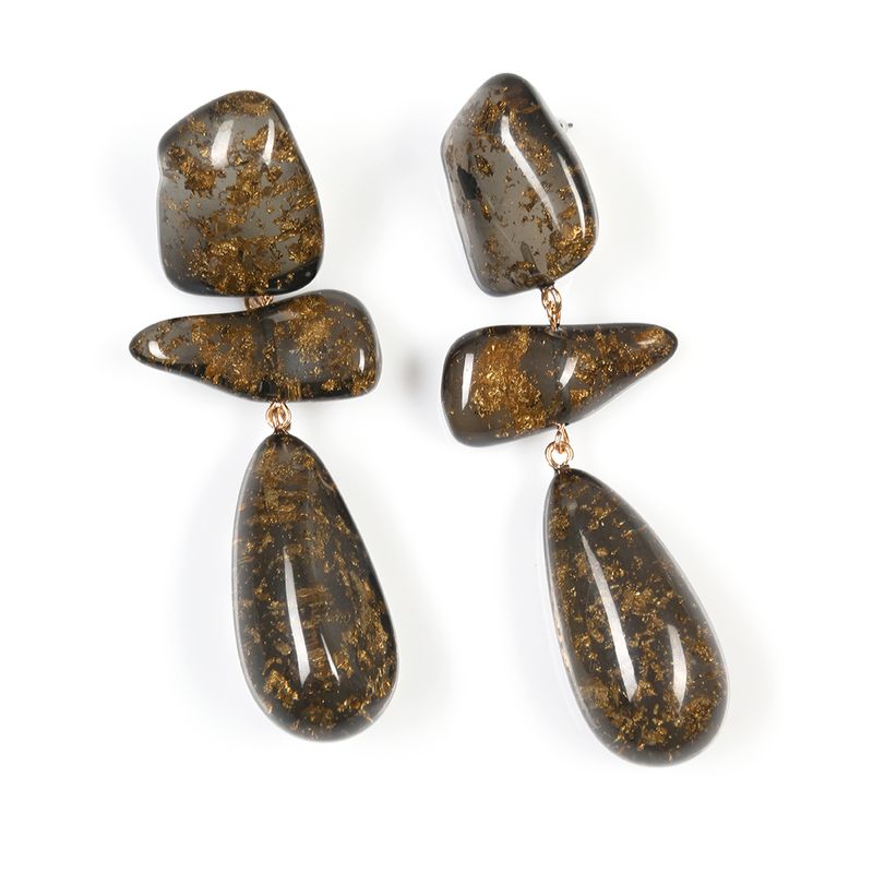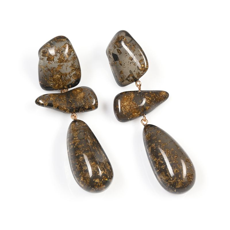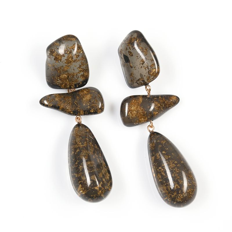 Cercei cu design artistic, realizati din rasina translucida cu efect de piatra naturala si particule aurii. Formele organice si luciul elegant ii transforma in piesa centrala a oricarei tinute.