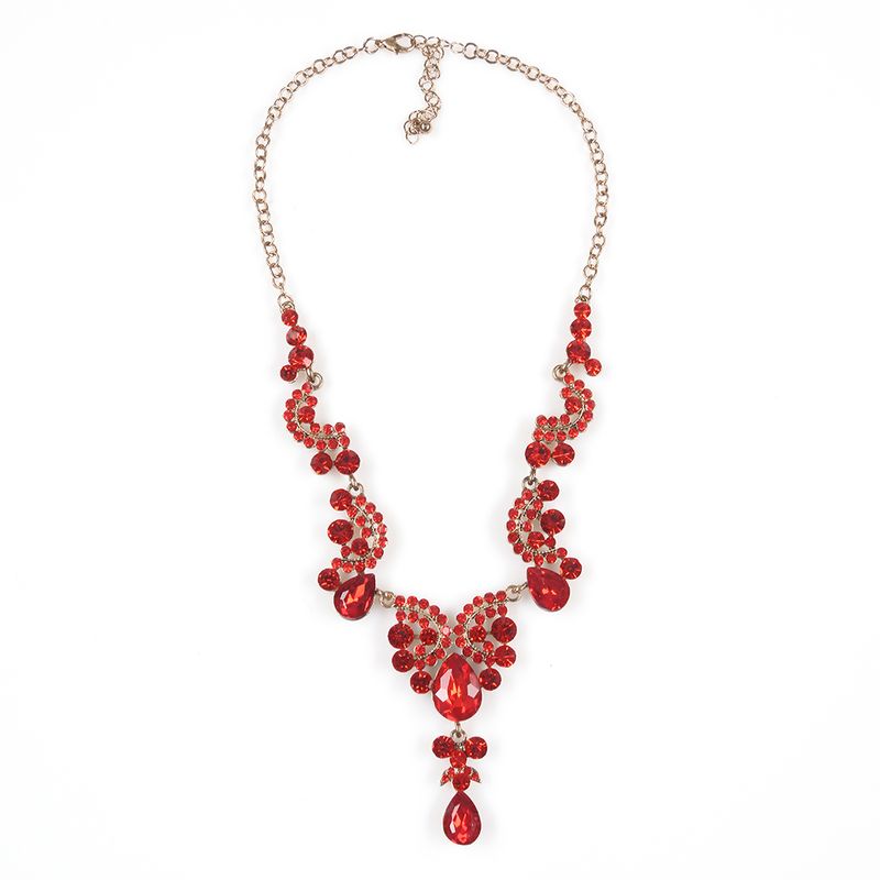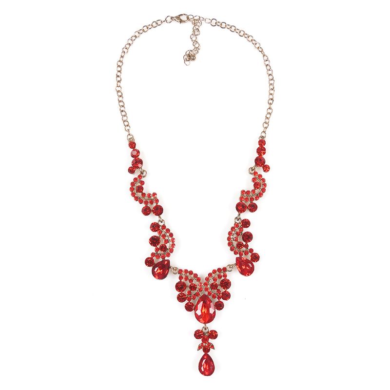 Colier stralucitor cu cristale rosii fatetate, dispuse in forme curbe si lacrimi decorative. Ideal pentru tinute de gala sau evenimente speciale.