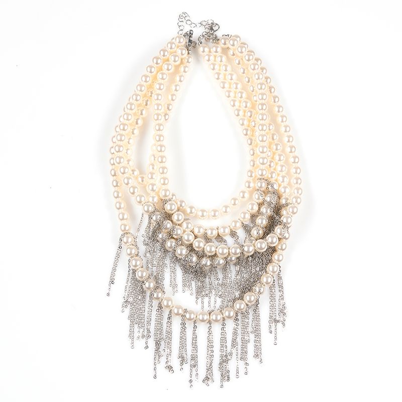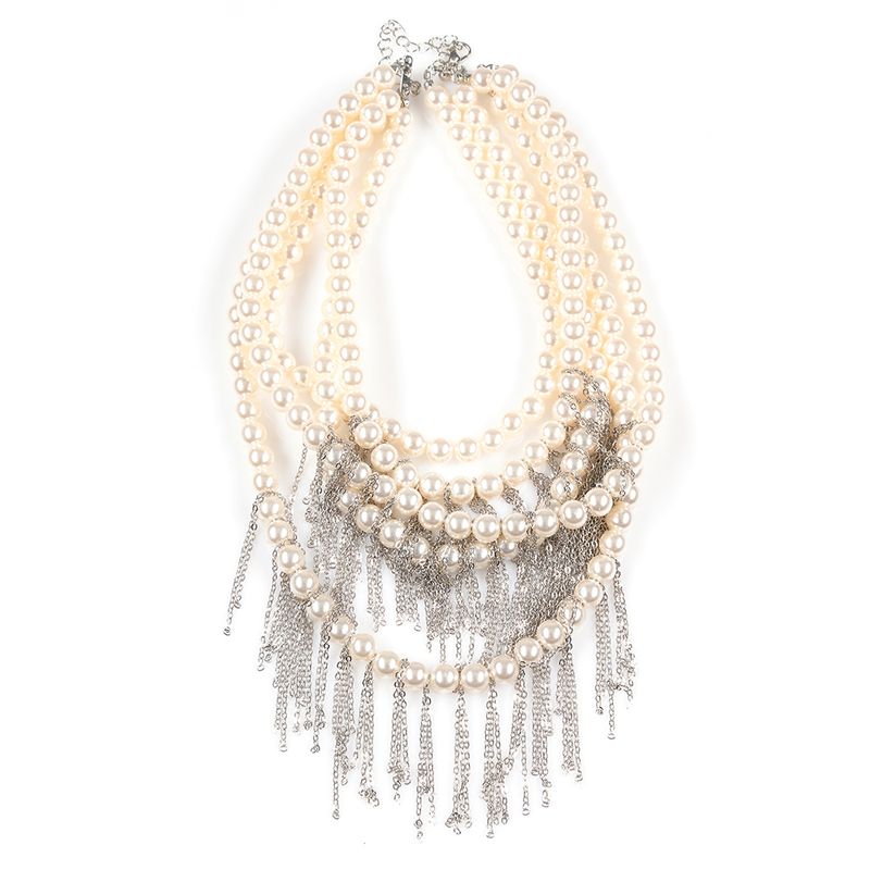 Colier multi-strat cu perle albe si franjuri argintii REF: 1A08CAJN133235-CL25T