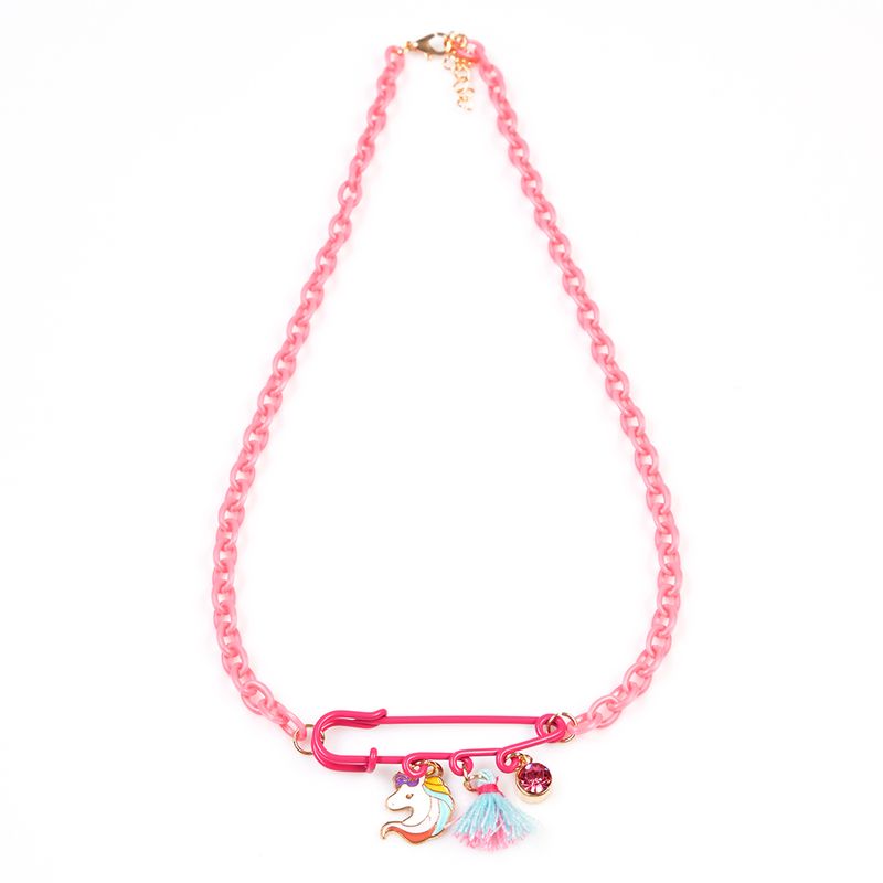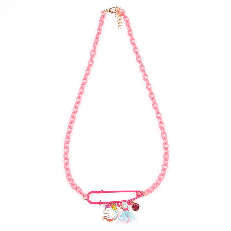 Colier cu lant din plastic roz, accesorizat cu o brosa tip ac de siguranta decorata cu pandantive: un unicorn colorat, un ciucure albastru si un stras roz. Un accesoriu jucaus si original, perfect pentru tinutele vesele ale celor mici.