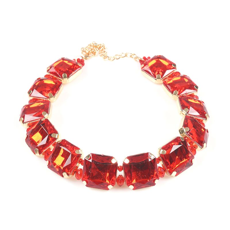 Colier elegant si impunator, compus din cristale rosii mari cu taietura patrata, montate in suport auriu. Un accesoriu spectaculos, ideal pentru evenimente de seara.