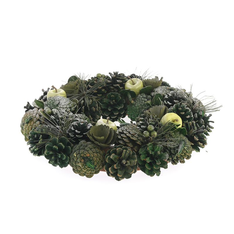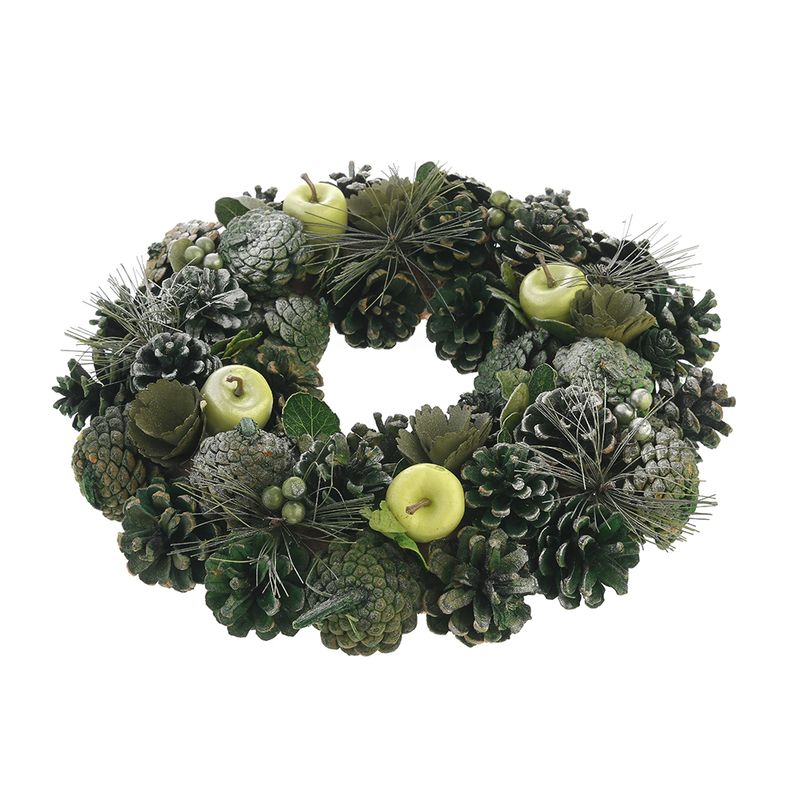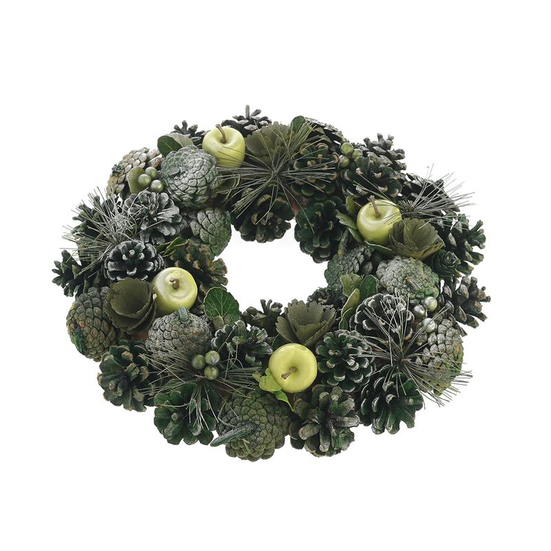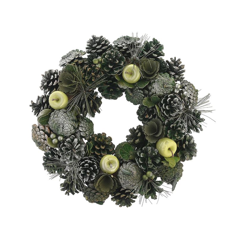 Coronita eleganta pentru decor sezonier, realizata din conuri naturale, frunze verzi, mere decorative si detalii cu aspect inghetat. Potrivita pentru usa, masa sau perete, aduce un aer rustic si festiv in orice spatiu.