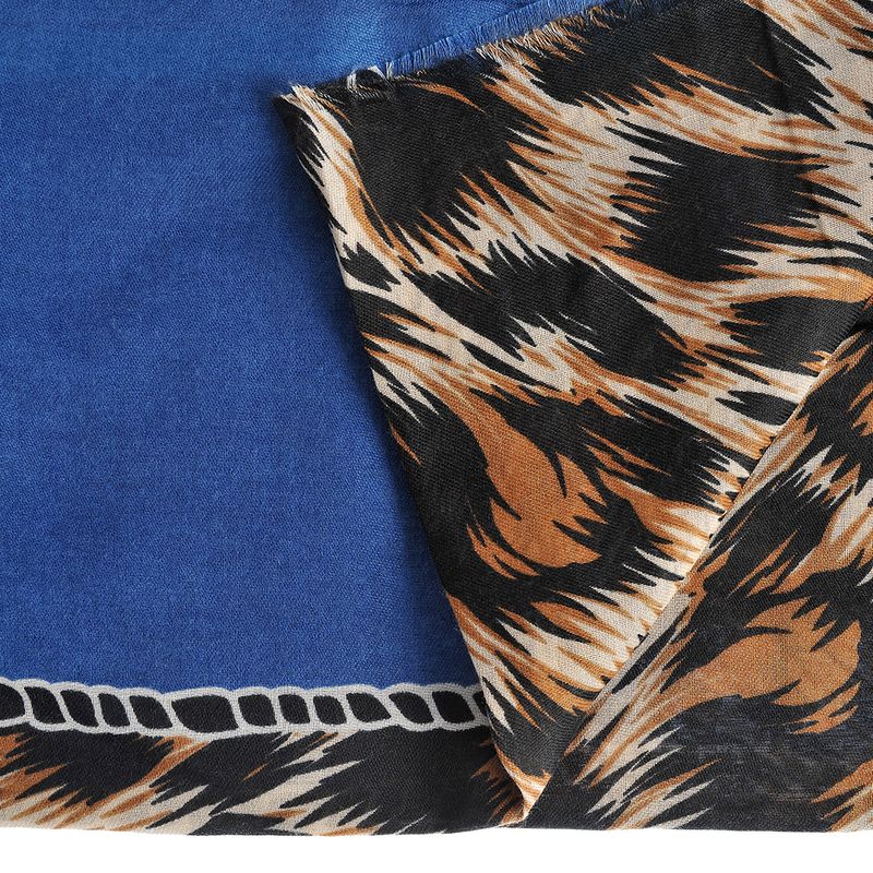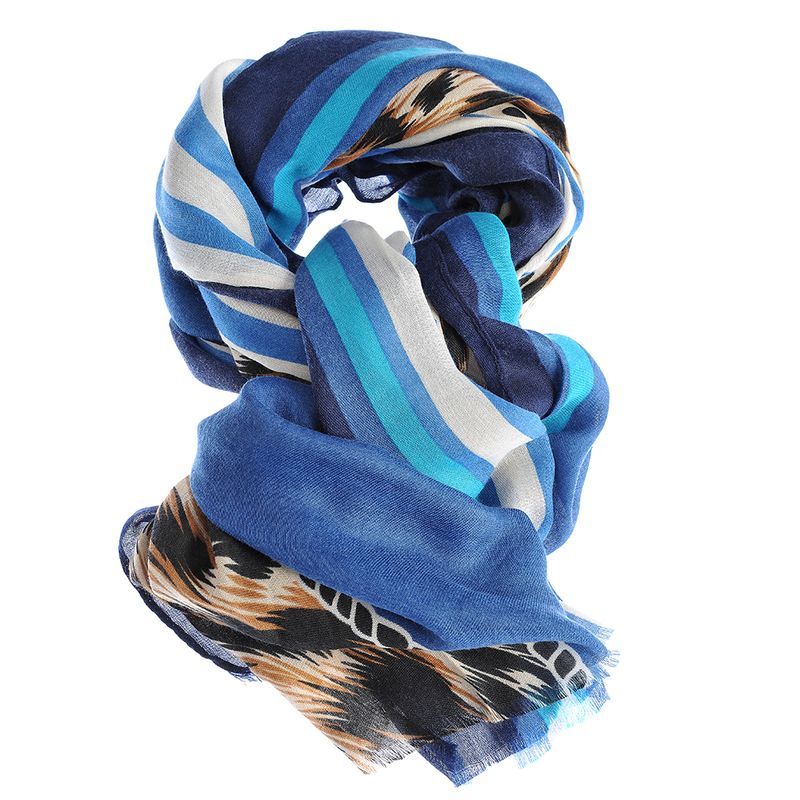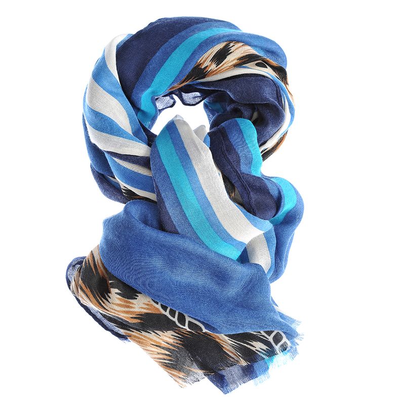 Esarfa moderna din material fin, decorata cu dungi albastre si accente abstracte in nuante de negru, crem si maro. Perfecta pentru tinute casual sau elegante, adauga un plus de prospetime si stil oricarei aparitii. Textura usoara si placuta la atingere.