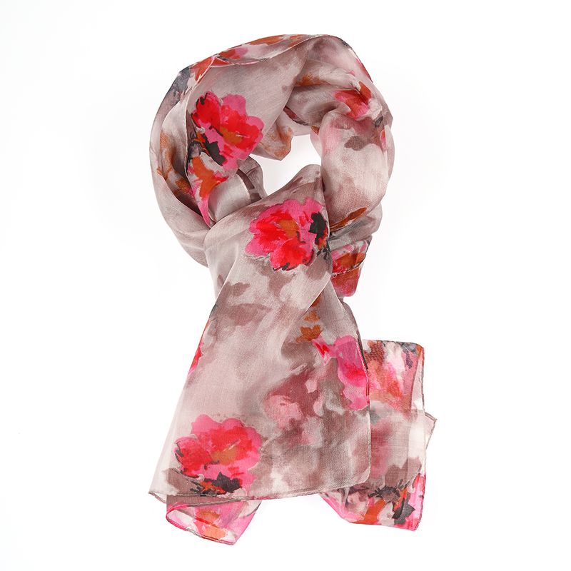 Esarfa din matase naturala cu flori fucsia pe fond taupe 50 x 180 cm REF: 1G05LENLE11642-CL26V