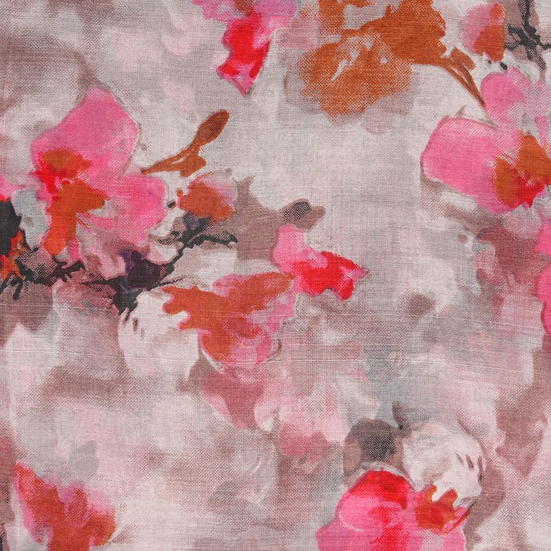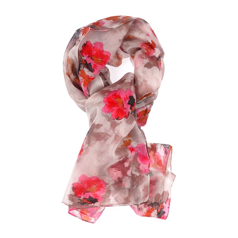 Aceasta esarfa din matase naturala imbina nuante elegante de taupe cu imprimeu floral in tonuri vibrante de fucsia si rosu. Un accesoriu rafinat ce aduce echilibru intre subtil si expresiv