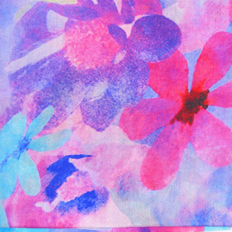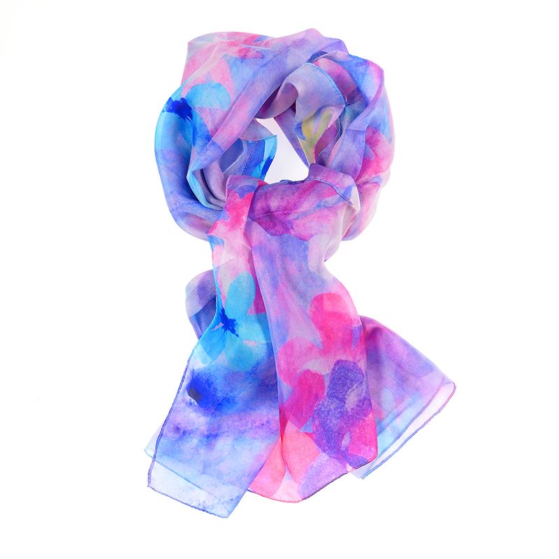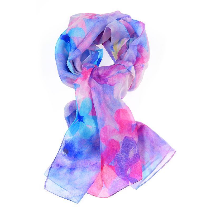 Esarfa din matase naturala ce impresioneaza prin imprimeul floral in stil acuarela, cu accente vibrante de roz, albastru si lila. Un accesoriu diafan si colorat, perfect pentru tinute romantice.