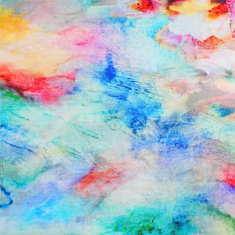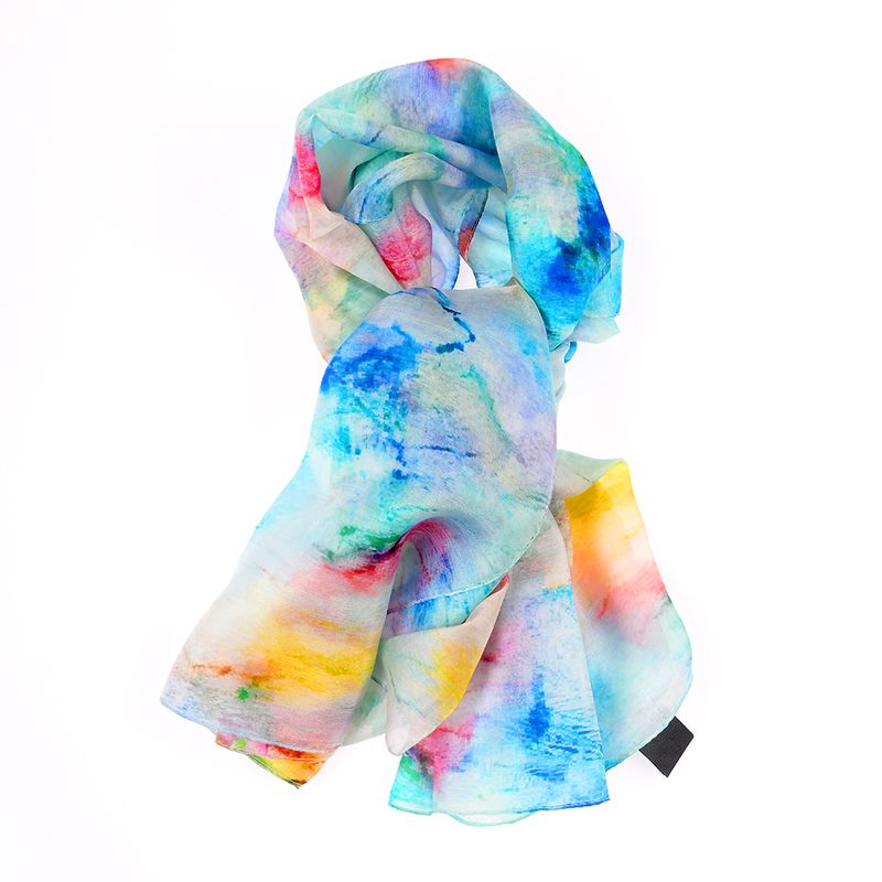 Exprima-ti creativitatea cu aceasta esarfa din matase fina, decorata cu un imprimeu viu, inspirat de pictura in acuarela. Culorile vibrante si textura fluida o transforma intr-un accesoriu chic si modern, perfect pentru tinute lejere sau elegante.