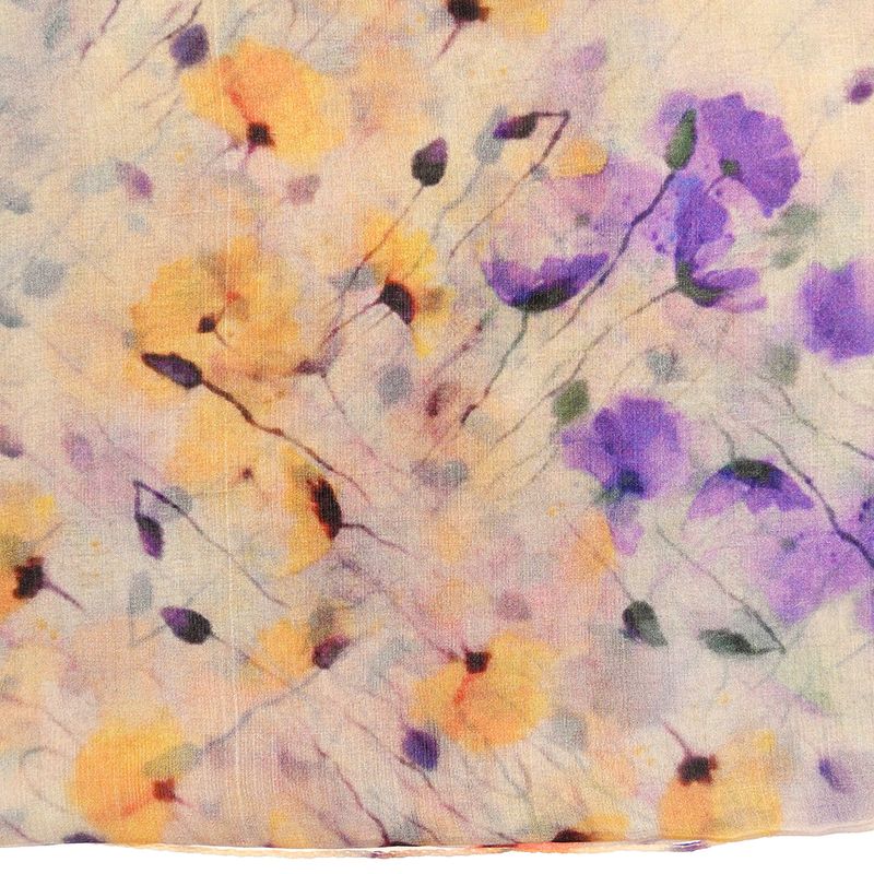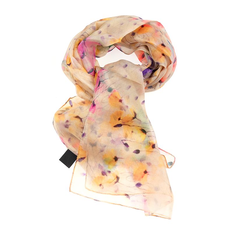 Esarfa eleganta realizata din matase vaporoasa, cu imprimeu floral discret in nuante calde de bej, galben si accente pastel. Textura fina ofera confort si un aspect rafinat, potrivit pentru completarea tinutelor casual sau elegante. Usor de purtat si de asortat, adauga un plus de stil in orice sezon.
