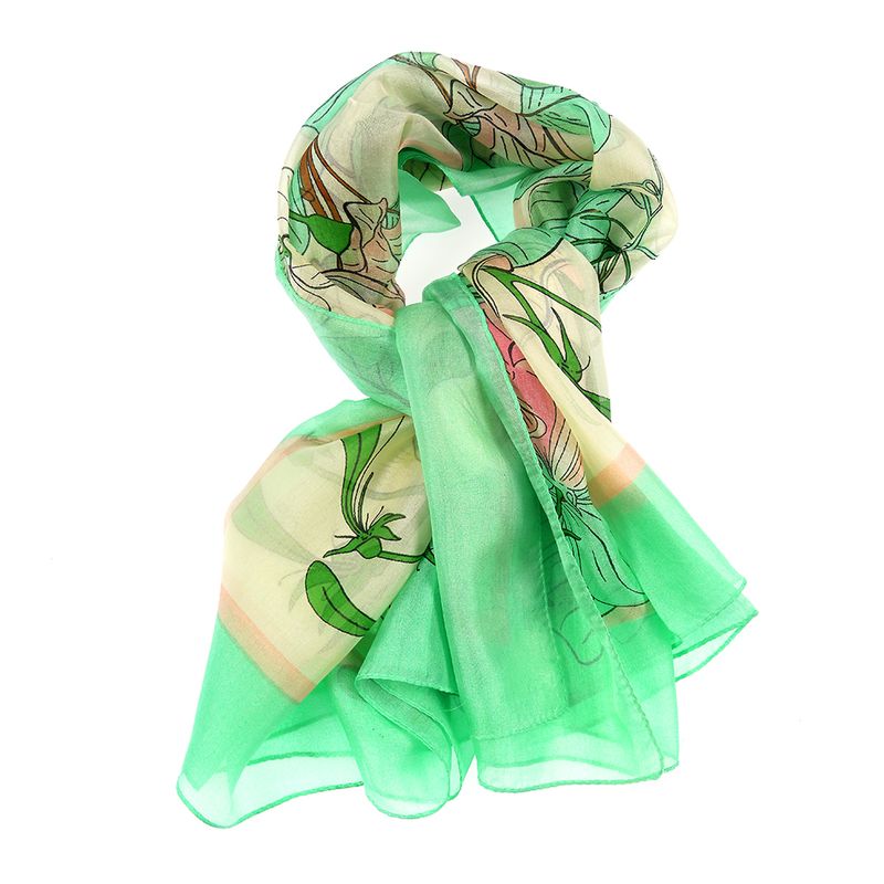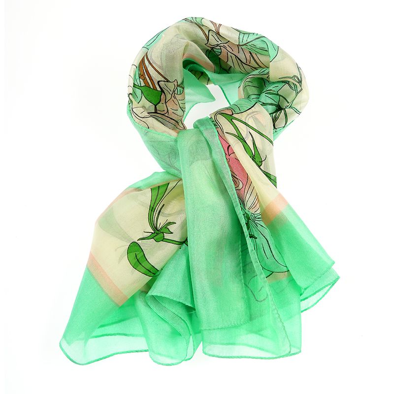 Aceasta esarfa rafinata din matase in nuante de verde si crem este decorata cu un imprimeu floral stilizat ce aduce prospetime si feminitate. Ideala pentru primavara sau vara, adauga un accent luminos si delicat oricarei tinute.