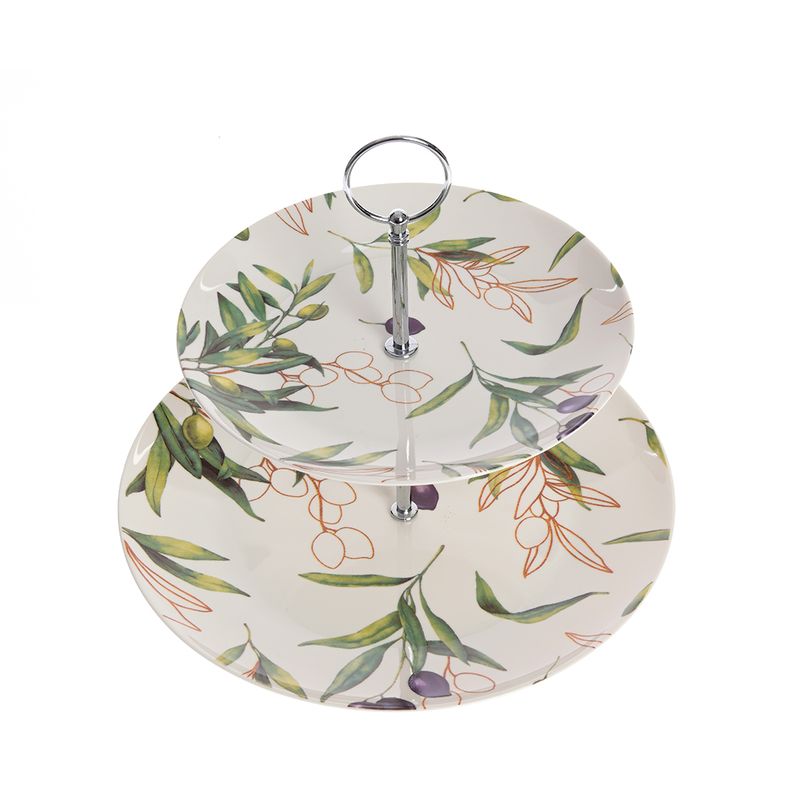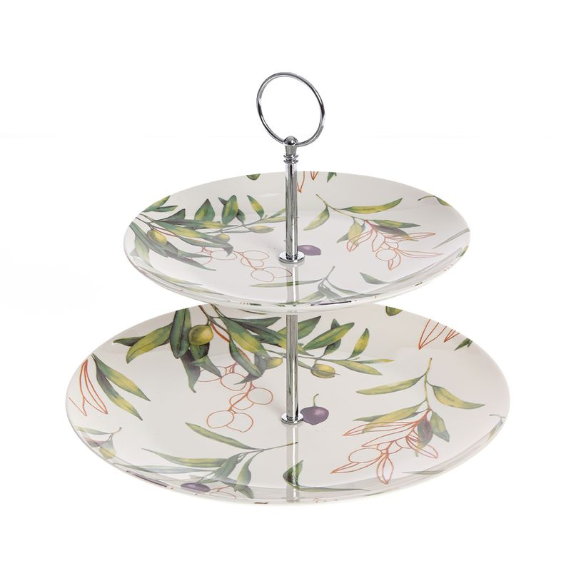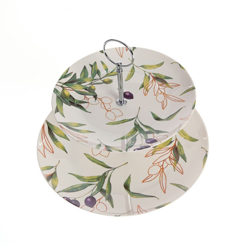 Etajera eleganta cu 2 platouri ceramice decorate cu ramuri de maslin, ideala pentru servirea prajiturilor, fructelor sau gustarilor. Accesoriu chic pentru mese festive.