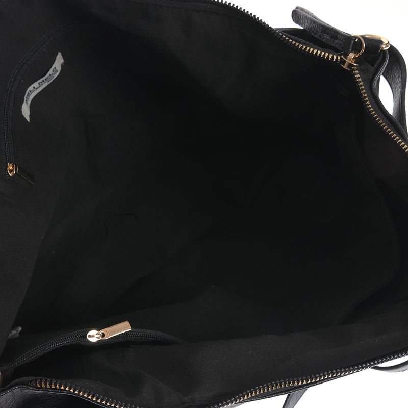 Tip produs: Geanta de umar Material: Poliuretan Culoare: Negru Compozitie: 90% Poliuretan, 10% Aliaj zinc Sistem inchidere: Fermoar Dimensiune: ~ 12 x 35 x 28 cm ( l x L x H ) Detalii: Are doua manere fixe, o bareta ajustabila si detasabila.