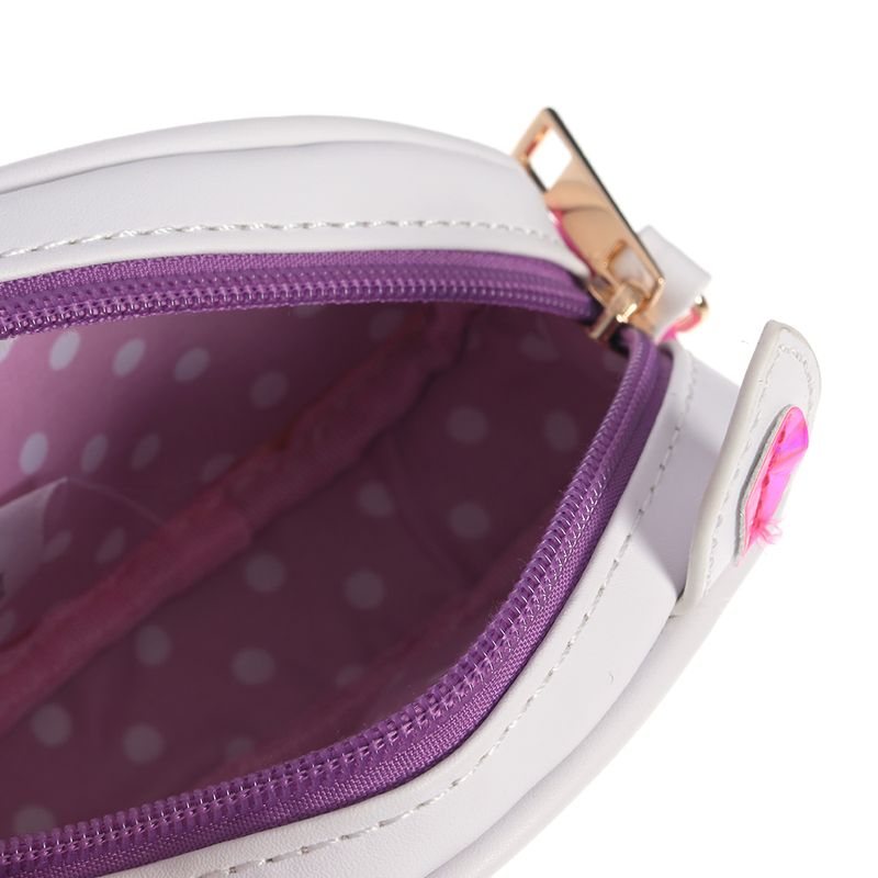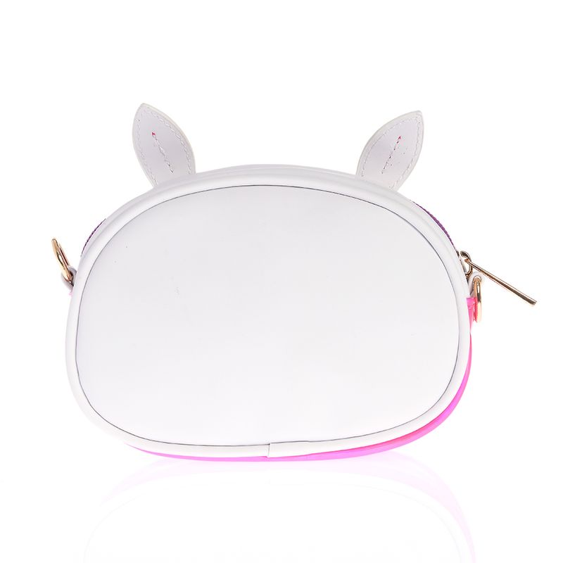 Geanta adorabila pentru fetite, decorata cu un unicorn multicolor pe fundal de curcubeu si flori. Design unic cu urechi aplicate in partea de sus si bretea detasabila alba. Perfecta pentru tinute vesele si plimbarile de zi cu zi.