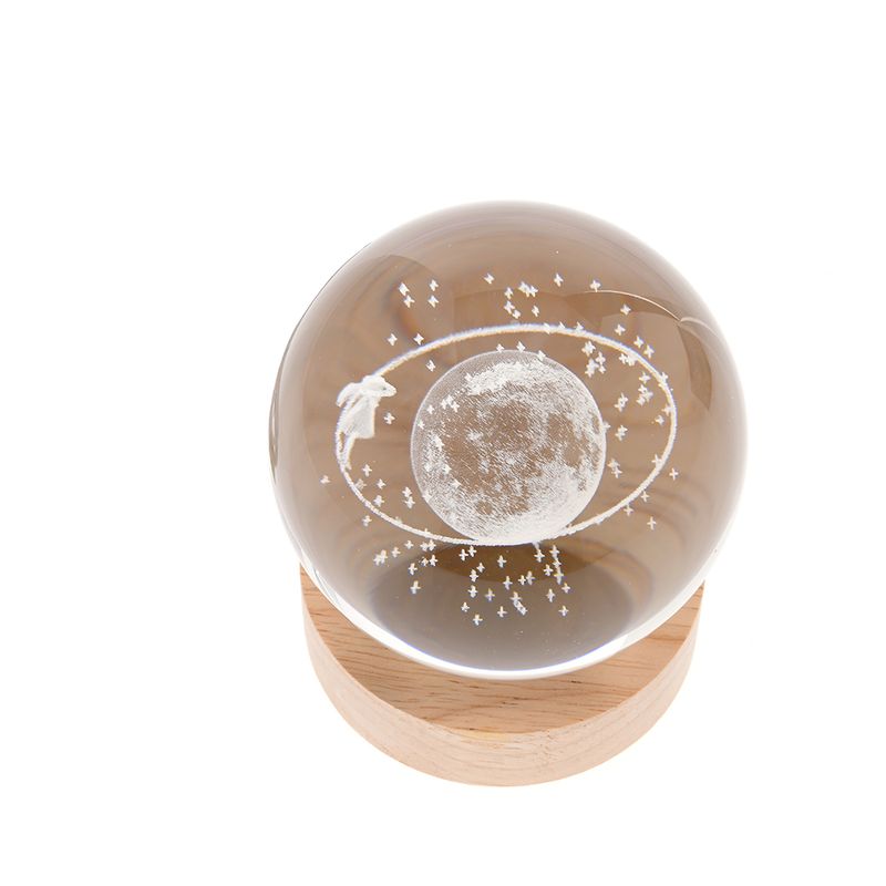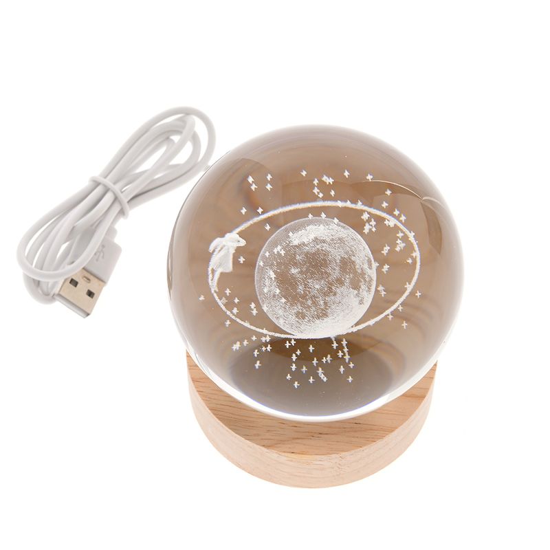 Glob decorativ din sticla cu iluminare LED si design 3D Saturn cu astronaut, ideal pentru birou sau cadou cu impact vizual. Baza din lemn adauga un accent natural, iar alimentarea USB ofera confort si mobilitate. Creeaza o atmosfera magica si futurista in orice spatiu.