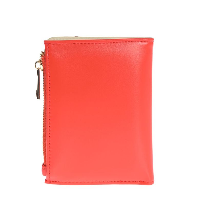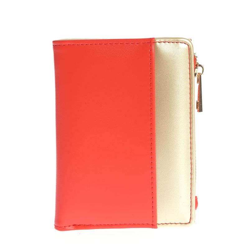 Tip produs: Portofel Material: Poliuretan Culoare: Rosu, Auriu Compozitie: -Exterior: 97% Poliuretan, 3% Aliaj zinc Sistem inchidere: Capsa, Fermoar Buzunare: sloturi card, buzunare interior si exterior Dimensiune: ~ 2 x 12 x 9 cm (l x L x H )