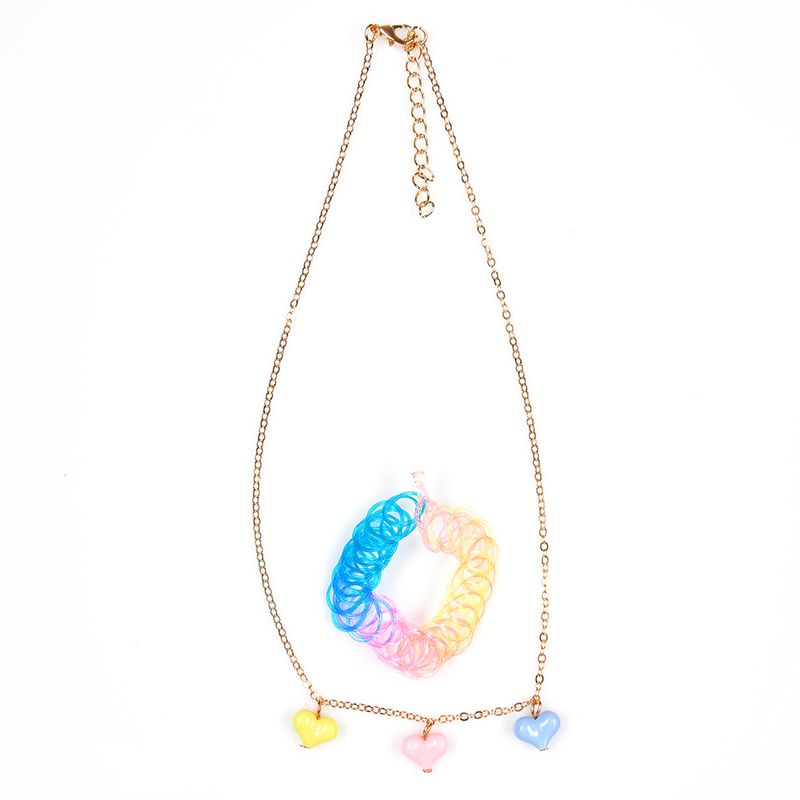 Set compus din 2 coliere cu lant fin auriu, fiecare decorat cu inimioare colorate, si 2 accesorii tip spirala in nuante pastelate (roz, galben, albastru si mov). Un set ideal pentru copii, oferind un look vesel si jucaus, perfect pentru tinutele de zi cu zi sau pentru cadou.