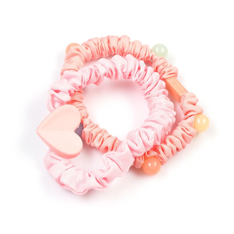 Set format din 2 elastice tip scrunchie, din material textil roz si piersica, decorate cu bilute colorate si inima din plastic. Accesorii vesele si confortabile, ideale pentru coafuri jucause si tinute casual.