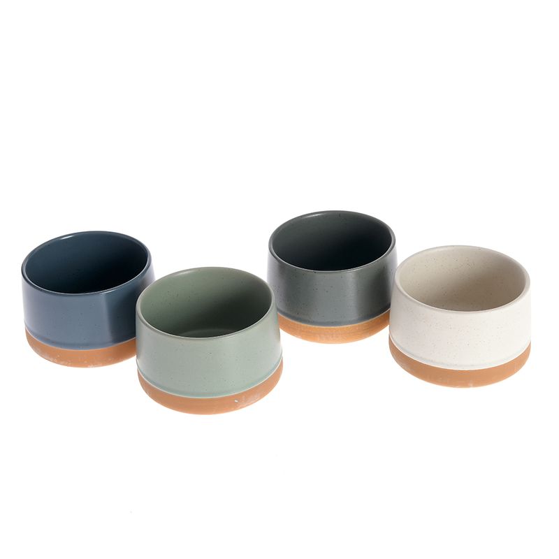 Set de 4 boluri ceramice in nuante mate variate, cu baza teracota neglazurata, potrivite pentru servirea sosurilor, deserturilor sau gustarilor. Design modern si versatil, ideal pentru utilizare zilnica.