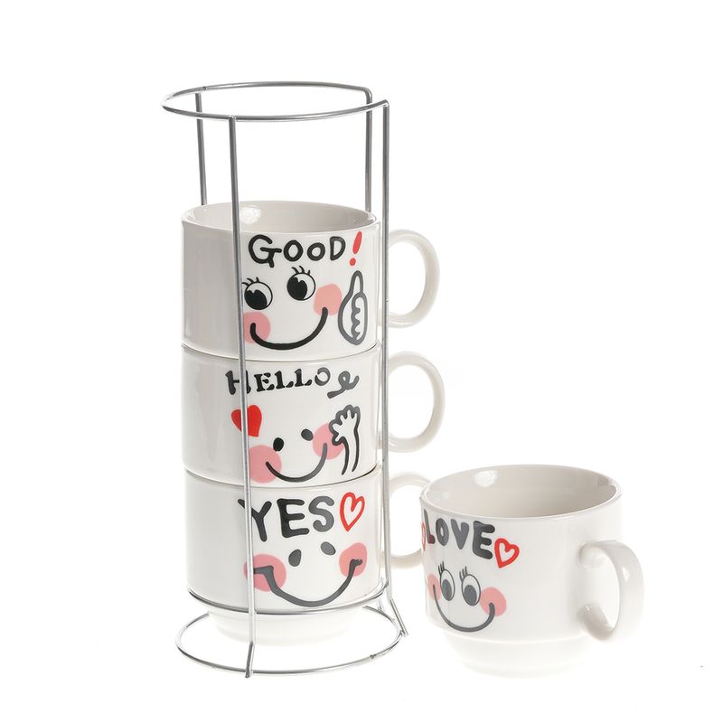 Tip produs: Set 4 cesti Material: Ceramica Culoare: Alb Capacitate: 170 ml Compozitie: 90% Ceramica, 10% Aliaj Imprimeul poate avea mici diferente fata de poza de prezentare.