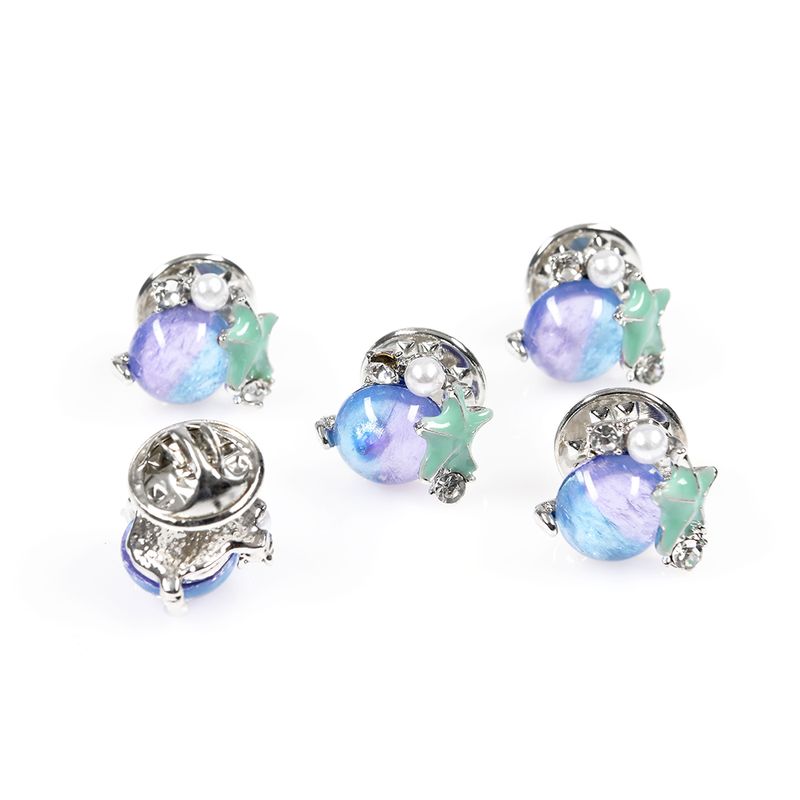 Tip produs: Brosa, contine snur de martisor si plic Material: Metalic Culoare: Albastru Compozitie: 50% Aliaj zinc, 50% Acrilic Dimensiuni: ~ 1.5 x 1.5 cm Sistem de prindere: Pin Nr buc/set: 5