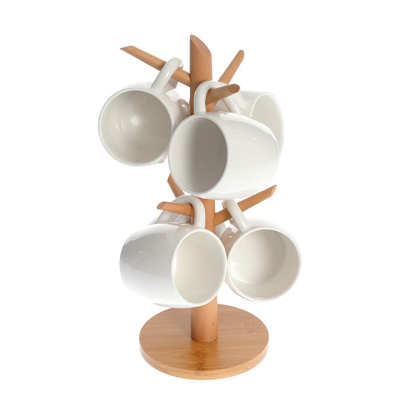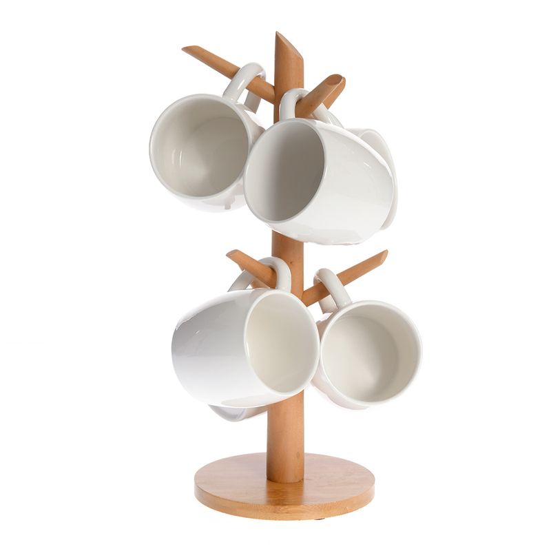 Set elegant cu 6 cani din ceramica alba si suport vertical din lemn, ideal pentru organizare si servire in bucatarie sau birou. Design compact si modern.