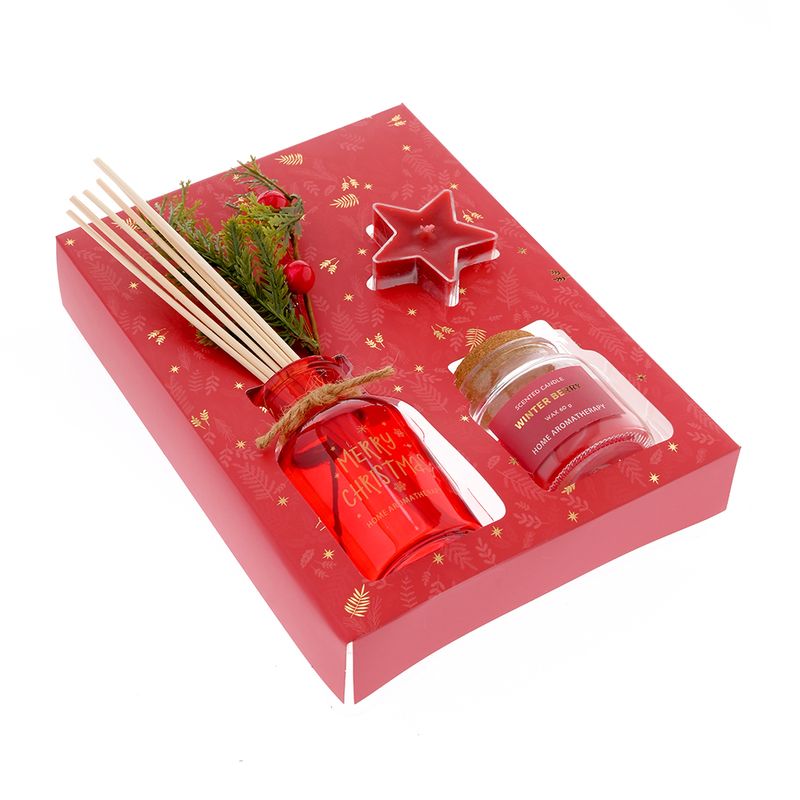 Tip produs: Set aromaterapie Aroma: Winter Berry Cantitate: 100 ml Compozitie: 50% Esenta parfumata, 50% Parafina Setul are un difuzor parfumat si 2 lumanari parfumate.
