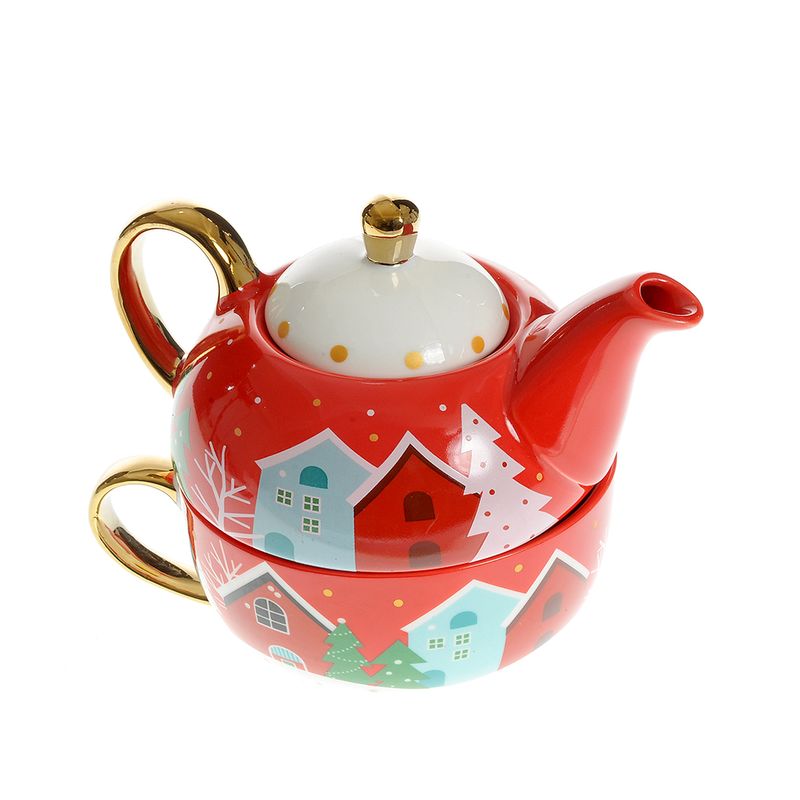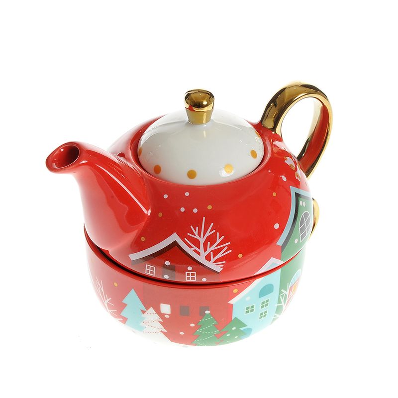 Set ceainic si ceasca Craciun cu design festiv si manere aurii REF: 2R08NOV46708-3-GN24T
