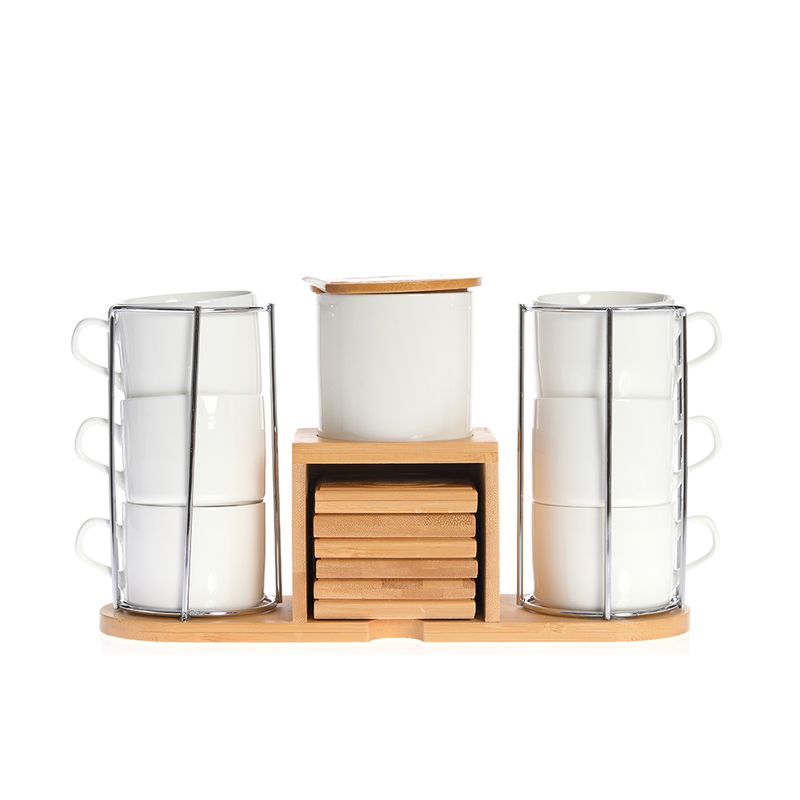 Set complet pentru momentele tale de relaxare, compus din 6 cesti ceramice, 6 suporturi din bambus si un recipient cu capac pentru zahar. Suportul organizator este realizat din bambus natural, oferind un aspect rafinat si functionalitate. Ideal pentru servirea cafelei sau ceaiului in stil elegant.