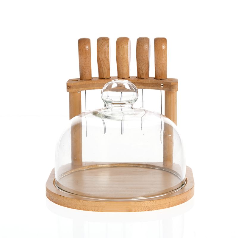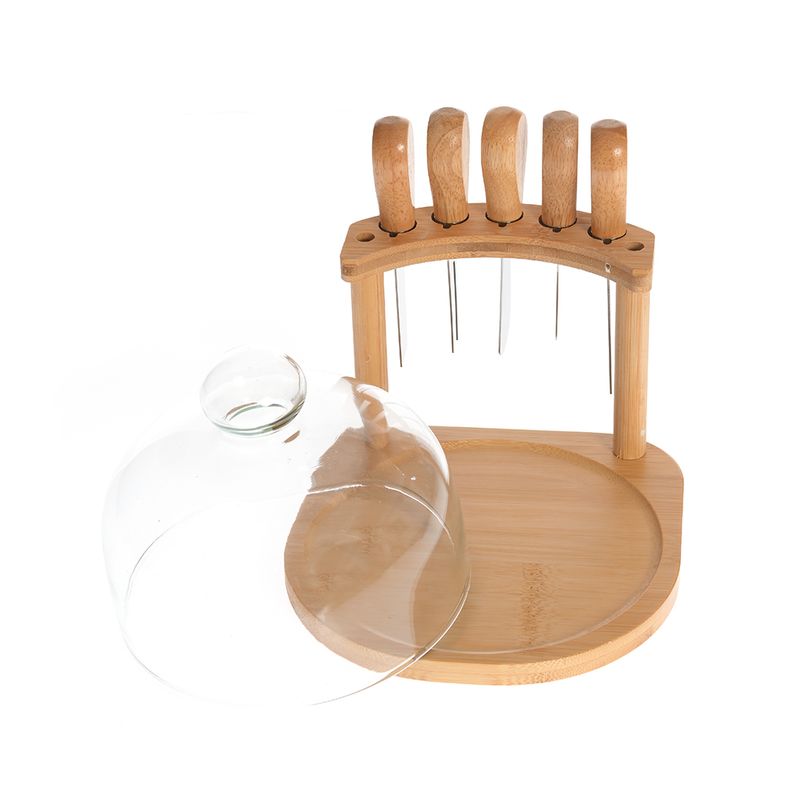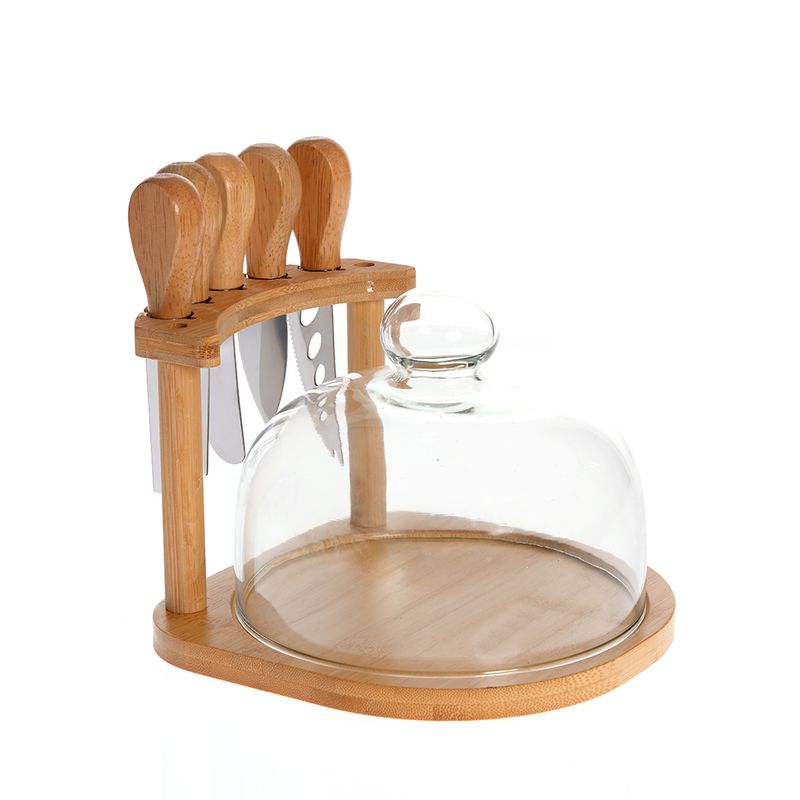 Set elegant pentru branzeturi, cu suport din bambus, capac din sticla si 4 ustensile cu maner din lemn. Ideal pentru prezentari rafinate la evenimente sau cine speciale.