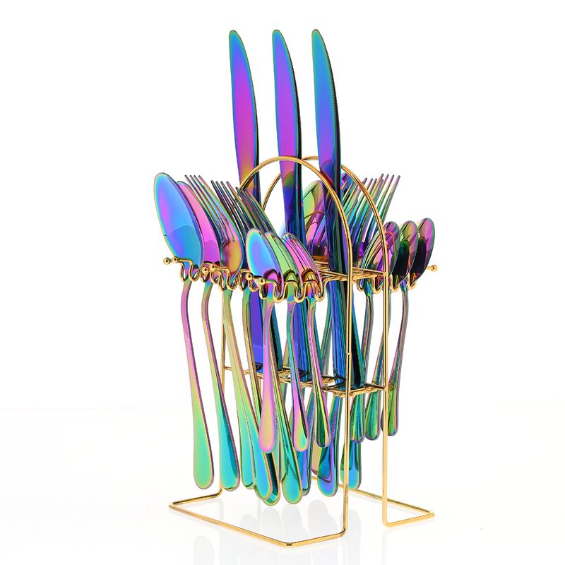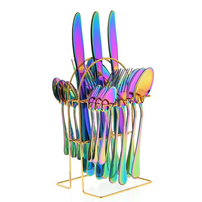 Set elegant de 24 tacamuri din inox cu finisaj curcubeu si suport metalic auriu, perfect pentru mese speciale sau uz zilnic. Include cutite, furculite, linguri si lingurite. Un accent modern si colorat pentru orice bucatarie.
