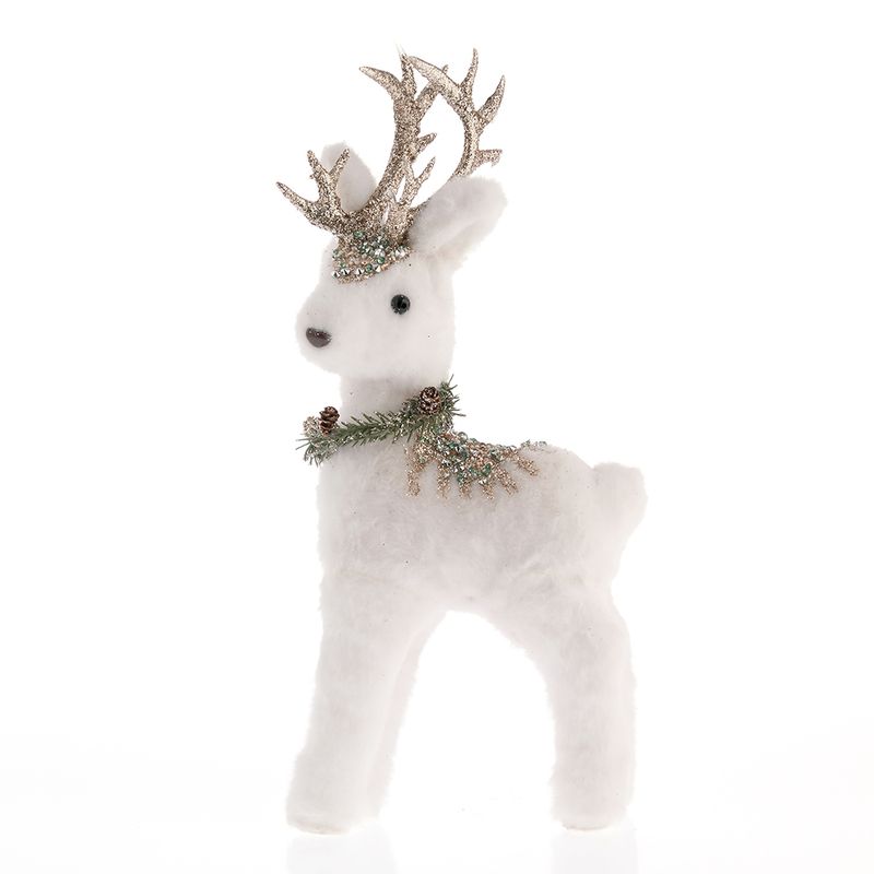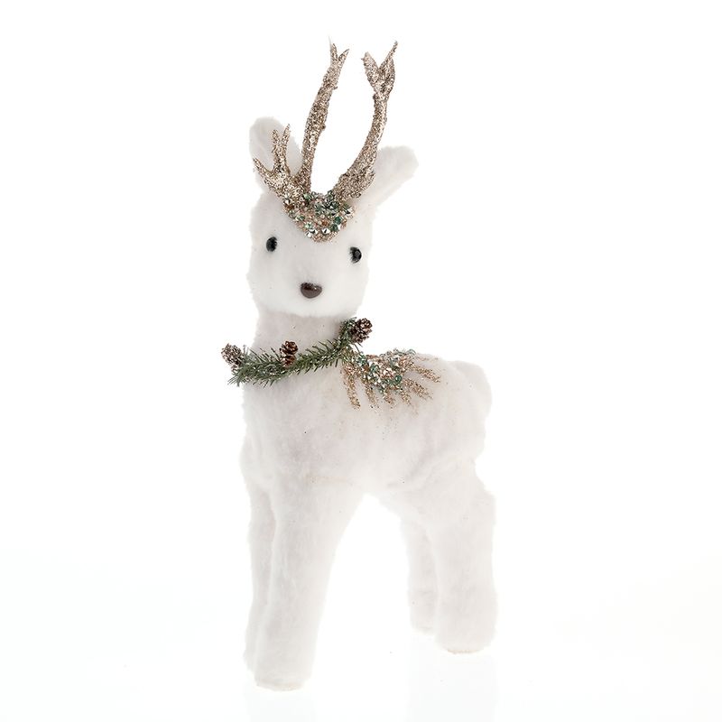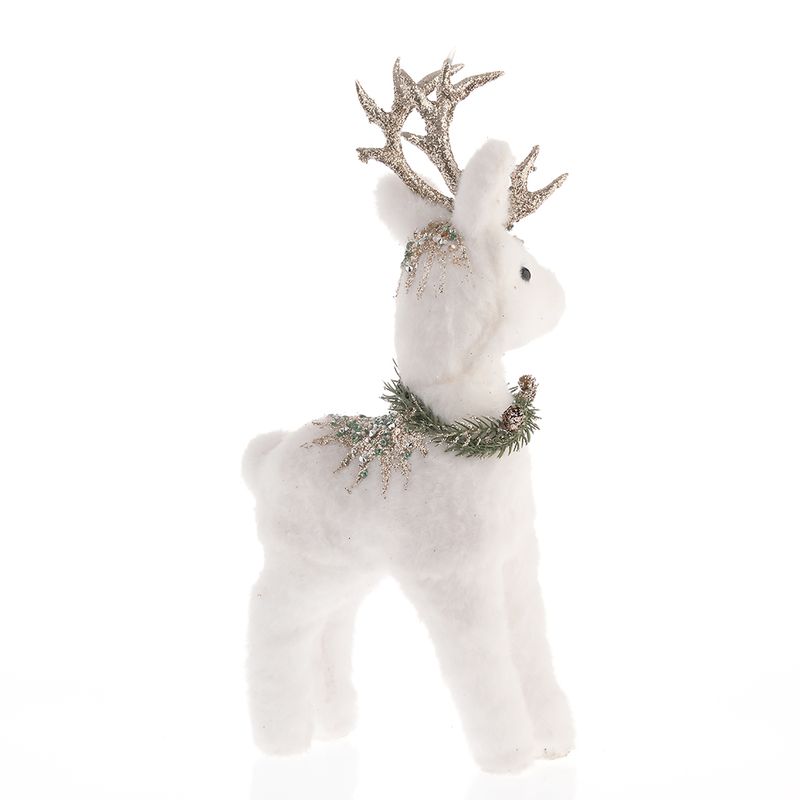 Statueta eleganta in forma de caprioara alba, decorata cu ghirlanda festiva si coarne stralucitoare. Realizata din material pufos, este perfecta pentru decorurile de iarna sau aranjamentele de Craciun.