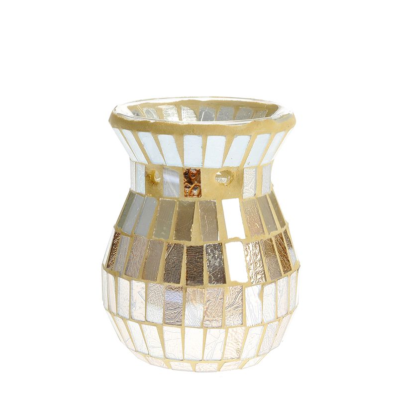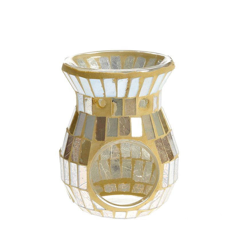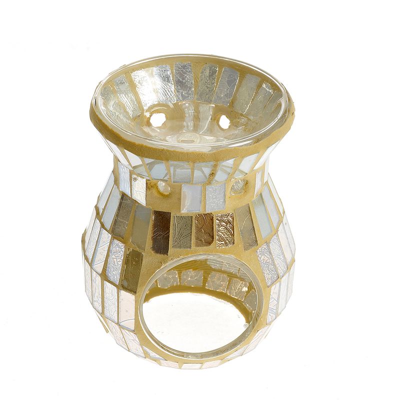 Suport elegant pentru aromaterapie, realizat manual din sticla cu insertii mozaic aurii, ideal pentru a crea o atmosfera calda si rafinata. Designul sau luminos si detaliile stralucitoare il transforma intr-un obiect decorativ deosebit pentru orice incapere. Potrivit pentru uleiuri esentiale sau ceara parfumata.