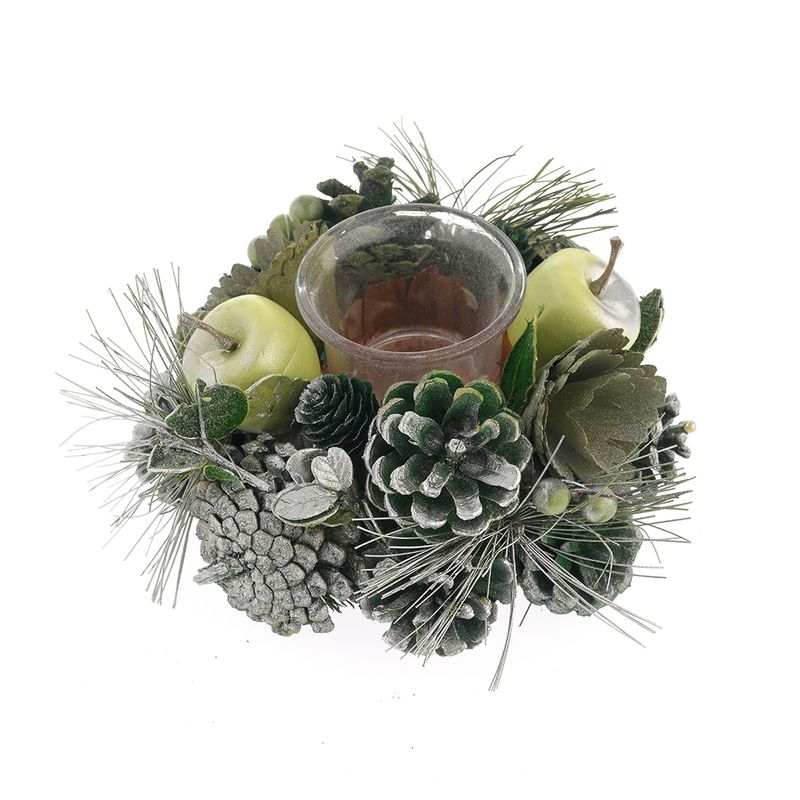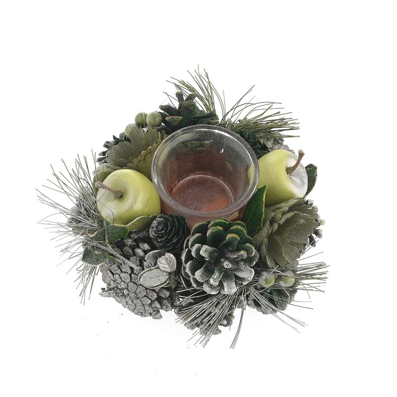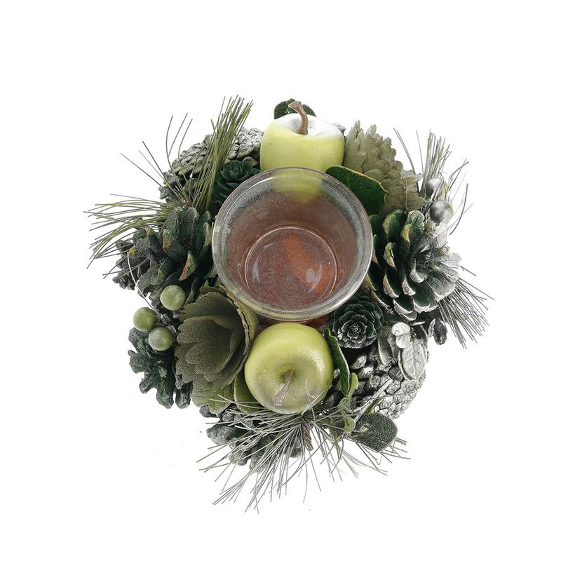 Suport de lumanare festiv, decorat cu mere verzi, conuri de brad si accente verzi cu aspect inghetat. Ideal pentru aranjamente de masa sau decoruri de sezon, aduce o nota naturala si eleganta.