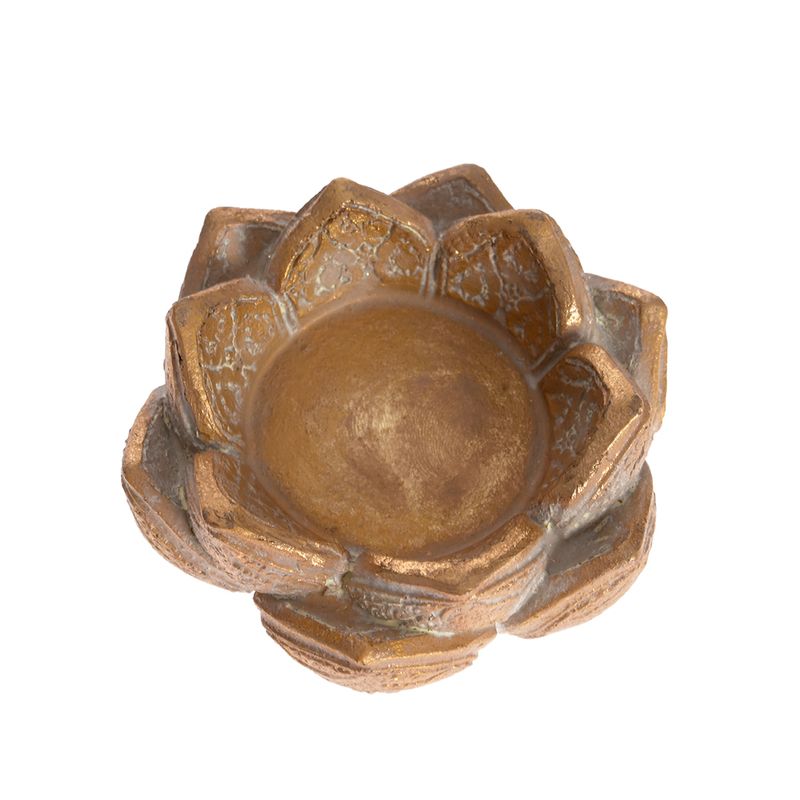 Suport decorativ pentru lumanare, realizat sub forma unei flori de lotus cu detalii reliefate si finisaj auriu cu aspect antichizat. Adauga un plus de eleganta si spiritualitate oricarui spatiu.
