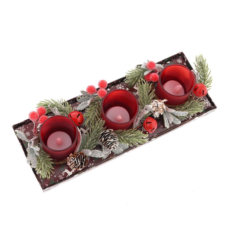 Suport lumanari rosu cu decor de sarbatori si conuri REF: 2R16ALB05A7284-GN25T